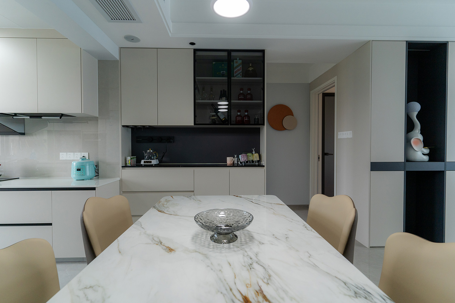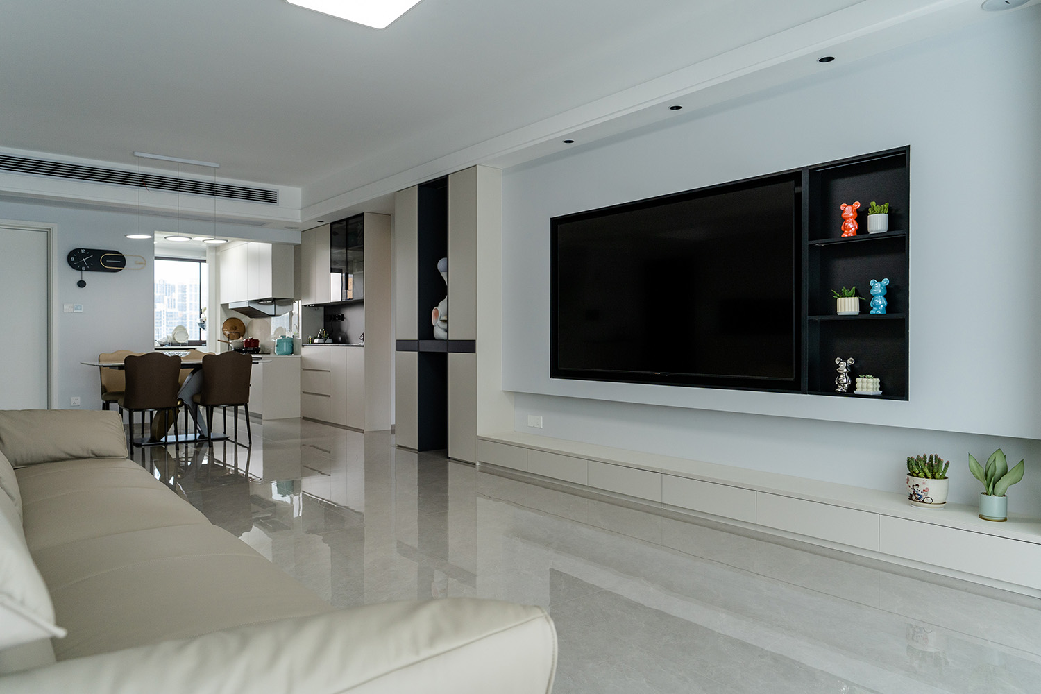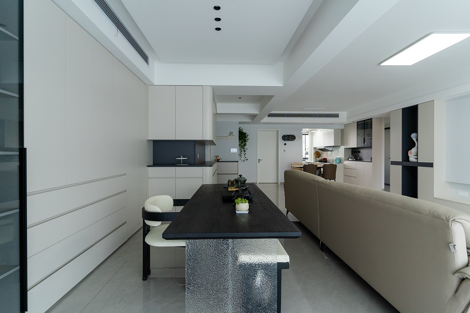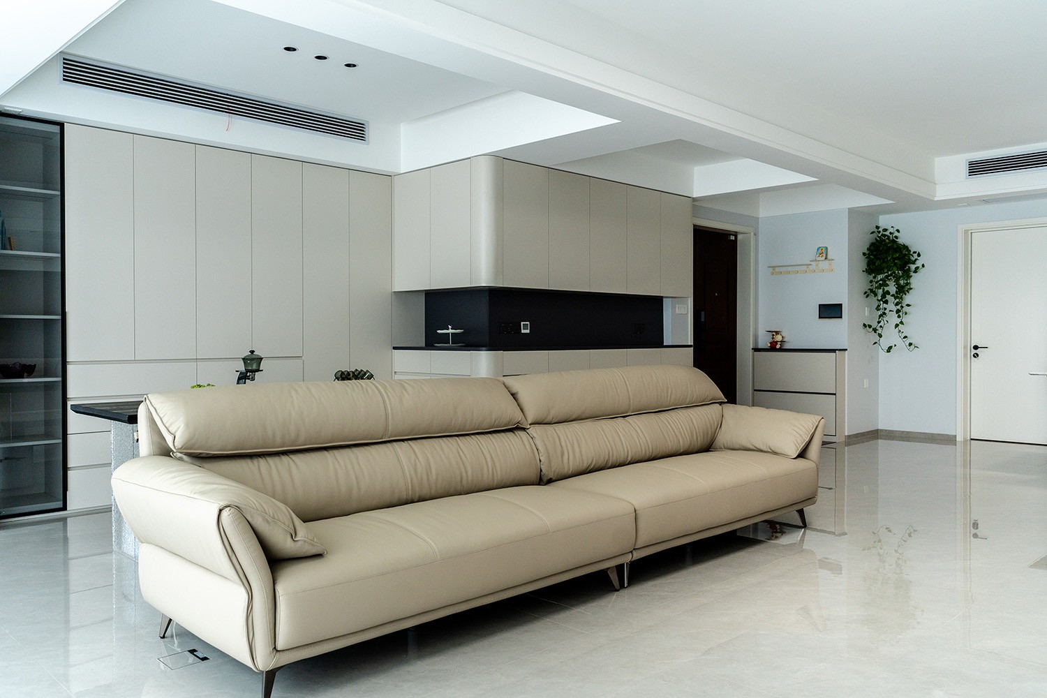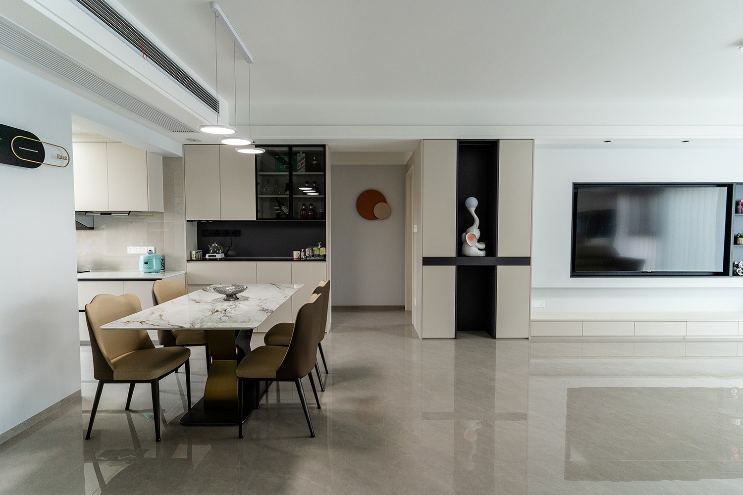 中海譽(yù)園130平米現(xiàn)代風(fēng)格的核心在于 “簡于形,精于心” 。現(xiàn)代風(fēng)格強(qiáng)調(diào)功能至上,摒棄冗雜裝飾,通過線條、色彩和材質(zhì)的巧妙搭配,打造出理性且溫馨的居住空間。對(duì)于130平米的三居室戶型,關(guān)鍵在于平衡開闊感與實(shí)用性,讓空間既有大宅的氣度,又不失生活的溫度。 本案的設(shè)計(jì)理念超越了單純的功能滿足,更注重空間的產(chǎn)品價(jià)值和情感體驗(yàn)。設(shè)計(jì)師通過打通陽臺(tái)納入客廳,實(shí)現(xiàn)客廳、餐廳、廚房、陽臺(tái)的無墻化直視交流,這種通透開敞的居住方式極大地提升了空間體驗(yàn)感。超大面寬的落地玻璃窗帶來的采光和無邊的景觀體驗(yàn),讓多樣化生活場景流暢轉(zhuǎn)換,共同構(gòu)筑出一方高質(zhì)量的居住天地。