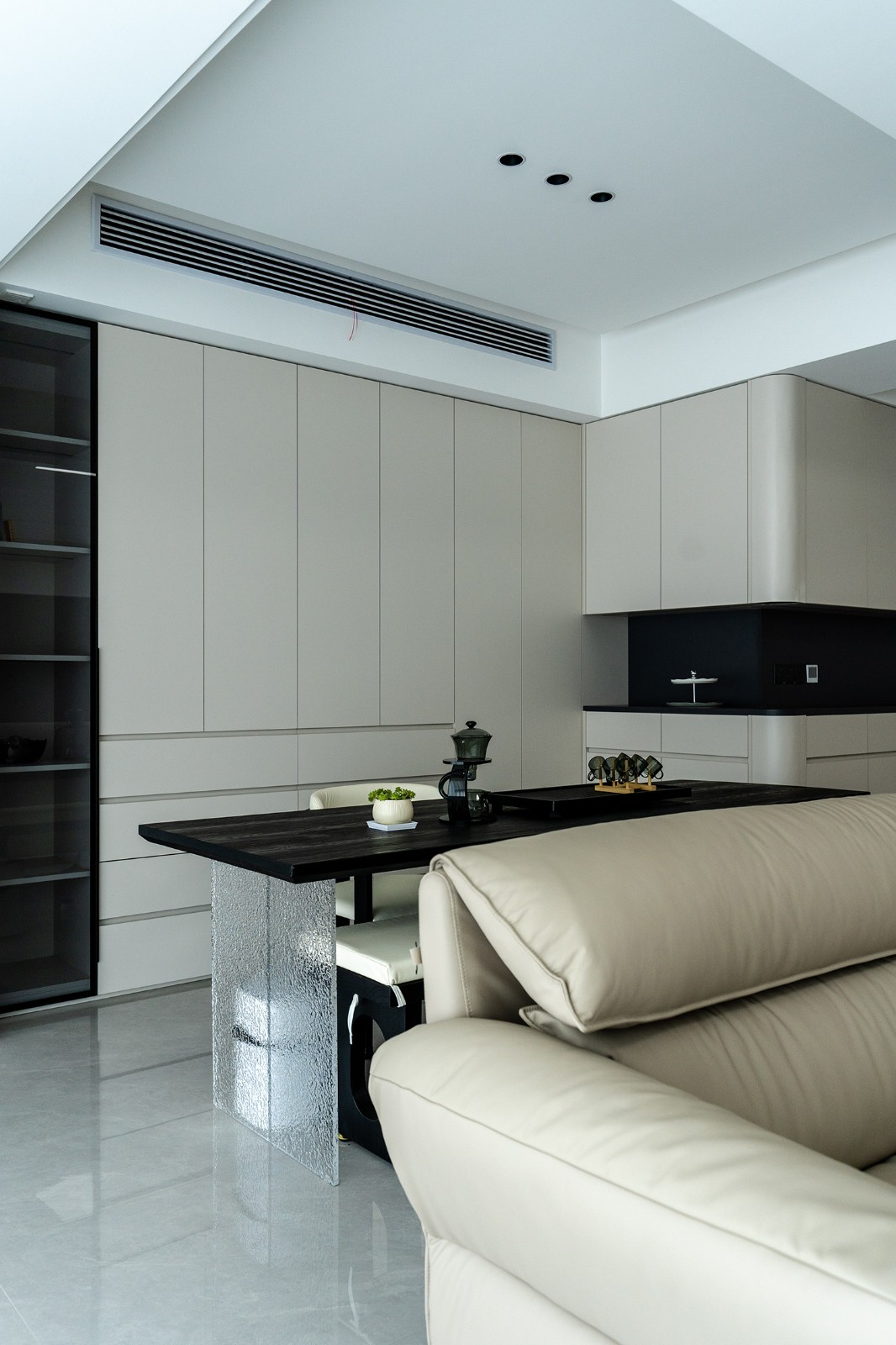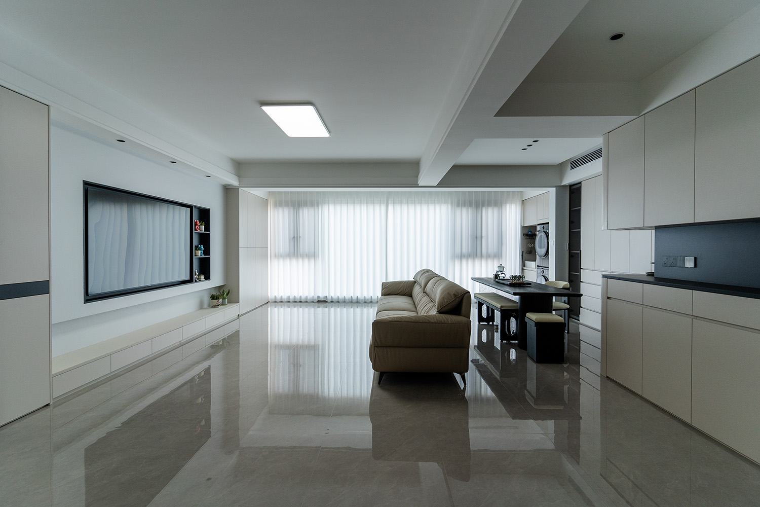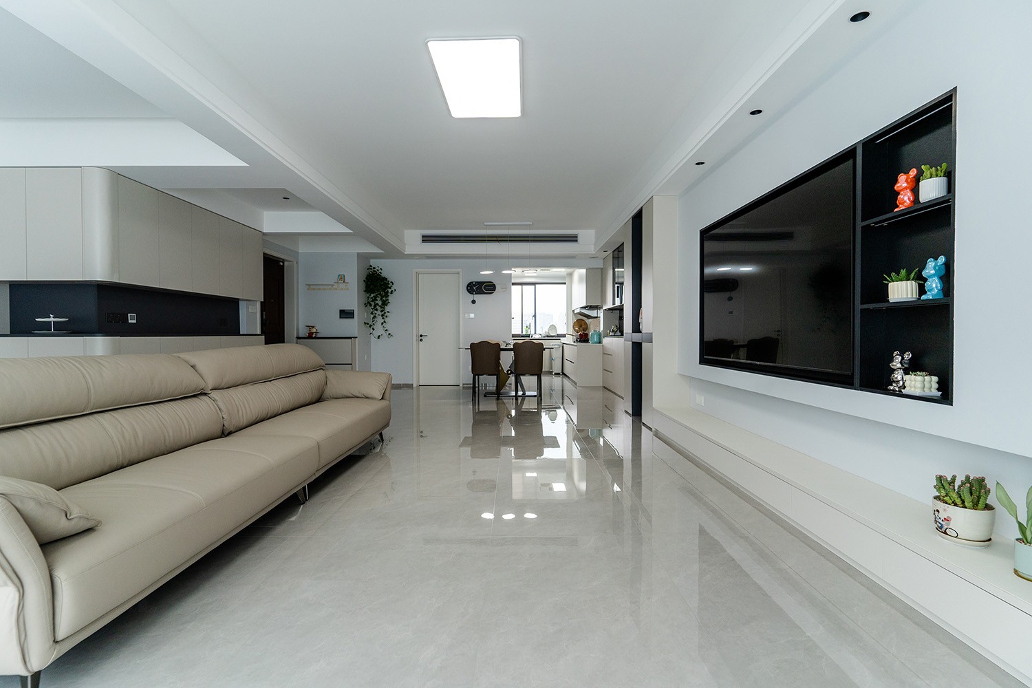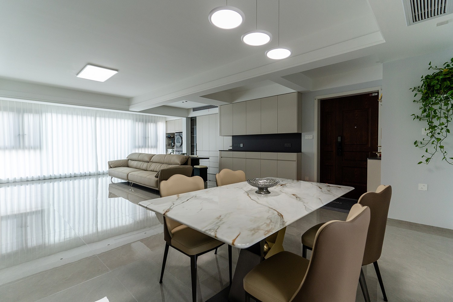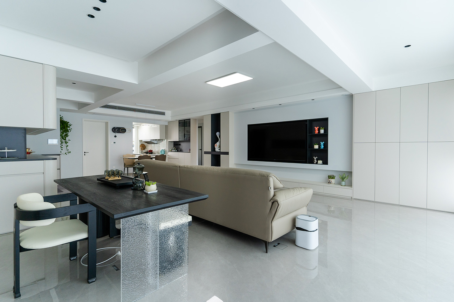 中海譽(yù)園130平米現(xiàn)代風(fēng)格的核心在于 “簡于形,精于心” 。現(xiàn)代風(fēng)格強(qiáng)調(diào)功能至上,摒棄冗雜裝飾,通過線條、色彩和材質(zhì)的巧妙搭配,打造出理性且溫馨的居住空間。對(duì)于130平米的三居室戶型,關(guān)鍵在于平衡開闊感與實(shí)用性,讓空間既有大宅的氣度,又不失生活的溫度。 本案的設(shè)計(jì)理念超越了單純的功能滿足,更注重空間的產(chǎn)品價(jià)值和情感體驗(yàn)。設(shè)計(jì)師通過打通陽臺(tái)納入客廳,實(shí)現(xiàn)客廳、餐廳、廚房、陽臺(tái)的無墻化直視交流,這種通透開敞的居住方式極大地提升了空間體驗(yàn)感。超大面寬的落地玻璃窗帶來的采光和無邊的景觀體驗(yàn),讓多樣化生活場景流暢轉(zhuǎn)換,共同構(gòu)筑出一方高質(zhì)量的居住天地。