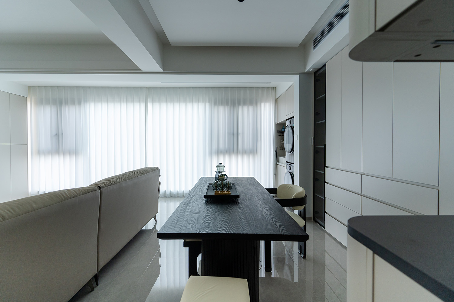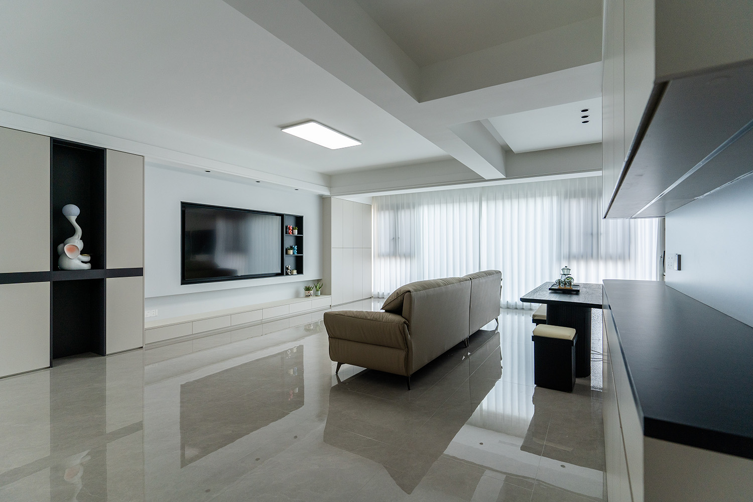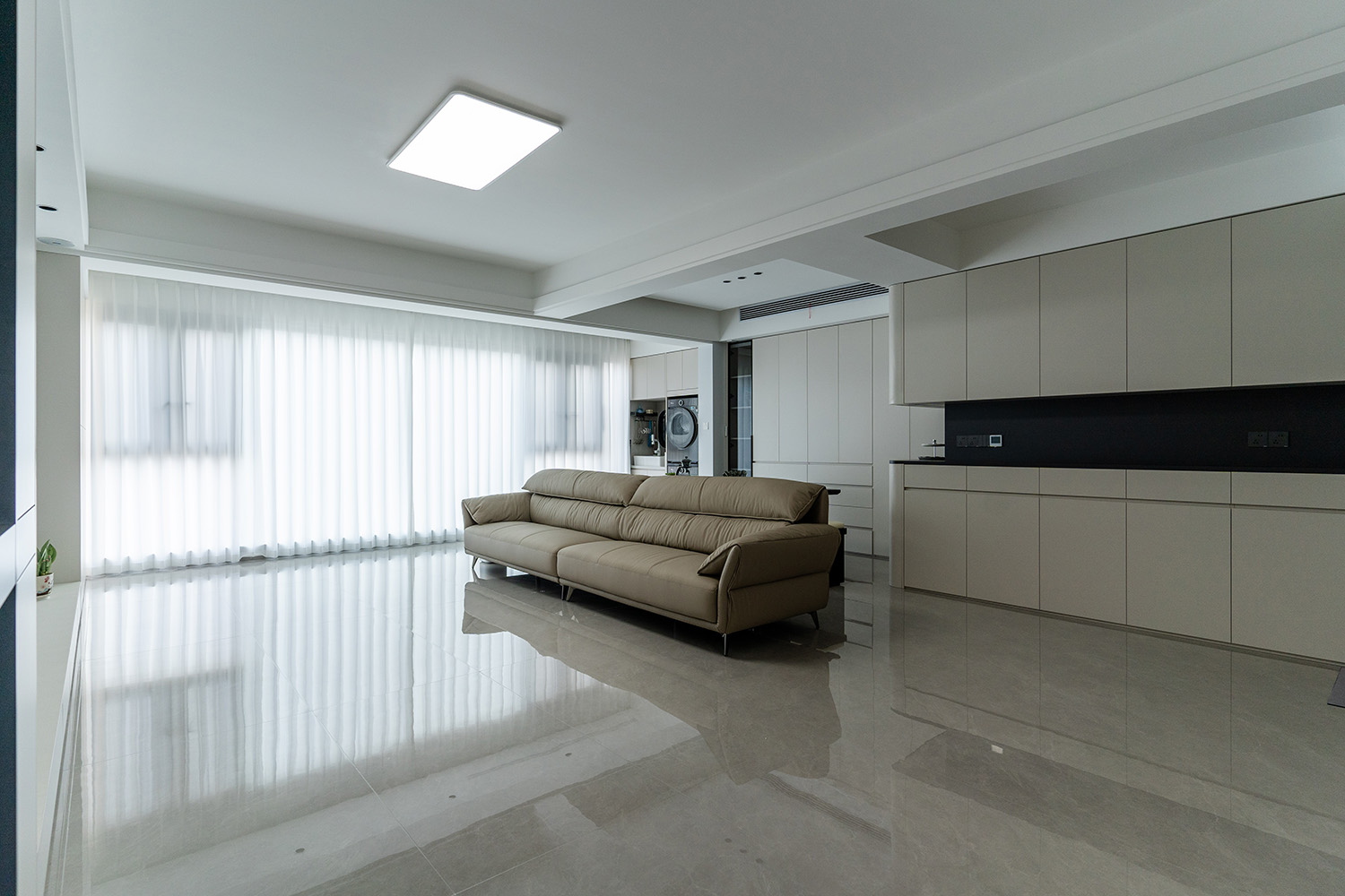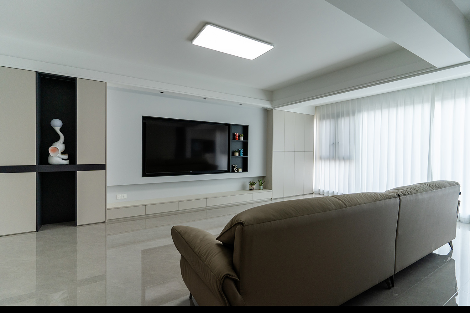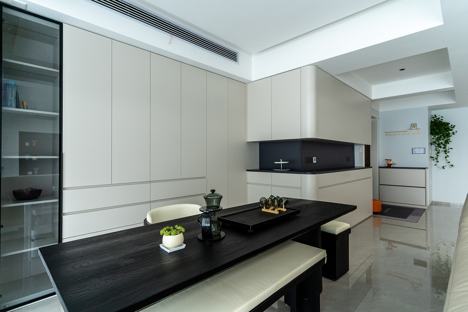 中海譽(yù)園130平米現(xiàn)代風(fēng)格的核心在于 “簡于形,精于心” 。現(xiàn)代風(fēng)格強(qiáng)調(diào)功能至上,摒棄冗雜裝飾,通過線條、色彩和材質(zhì)的巧妙搭配,打造出理性且溫馨的居住空間。對(duì)于130平米的三居室戶型,關(guān)鍵在于平衡開闊感與實(shí)用性,讓空間既有大宅的氣度,又不失生活的溫度。 本案的設(shè)計(jì)理念超越了單純的功能滿足,更注重空間的產(chǎn)品價(jià)值和情感體驗(yàn)。設(shè)計(jì)師通過打通陽臺(tái)納入客廳,實(shí)現(xiàn)客廳、餐廳、廚房、陽臺(tái)的無墻化直視交流,這種通透開敞的居住方式極大地提升了空間體驗(yàn)感。超大面寬的落地玻璃窗帶來的采光和無邊的景觀體驗(yàn),讓多樣化生活場景流暢轉(zhuǎn)換,共同構(gòu)筑出一方高質(zhì)量的居住天地。